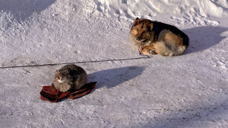 IrkutskMedia, 13 февраля. Фотография из в социальных сетях растрогала жителей Иркутска в разгар январских морозов. Кошка и собака на одной из городских автостоянок грели друг друга, чтобы пережить холода. Пушистая кошка забиралась псу на спину и ночевала с ним в будке — так они и коротали студеные дни и ночи. Редакция решила разыскать стоянку и узнать эту историю.