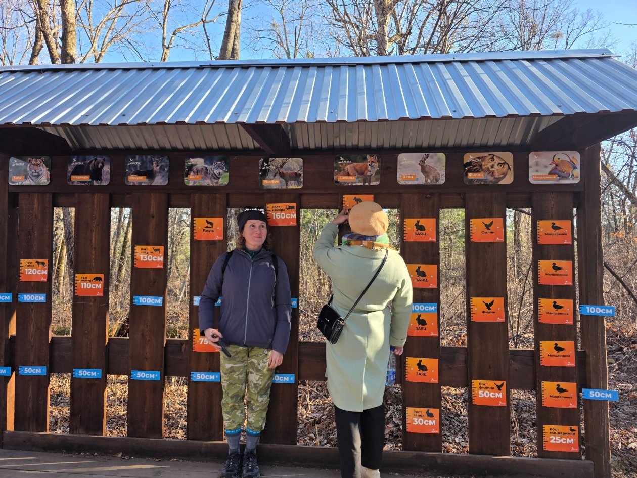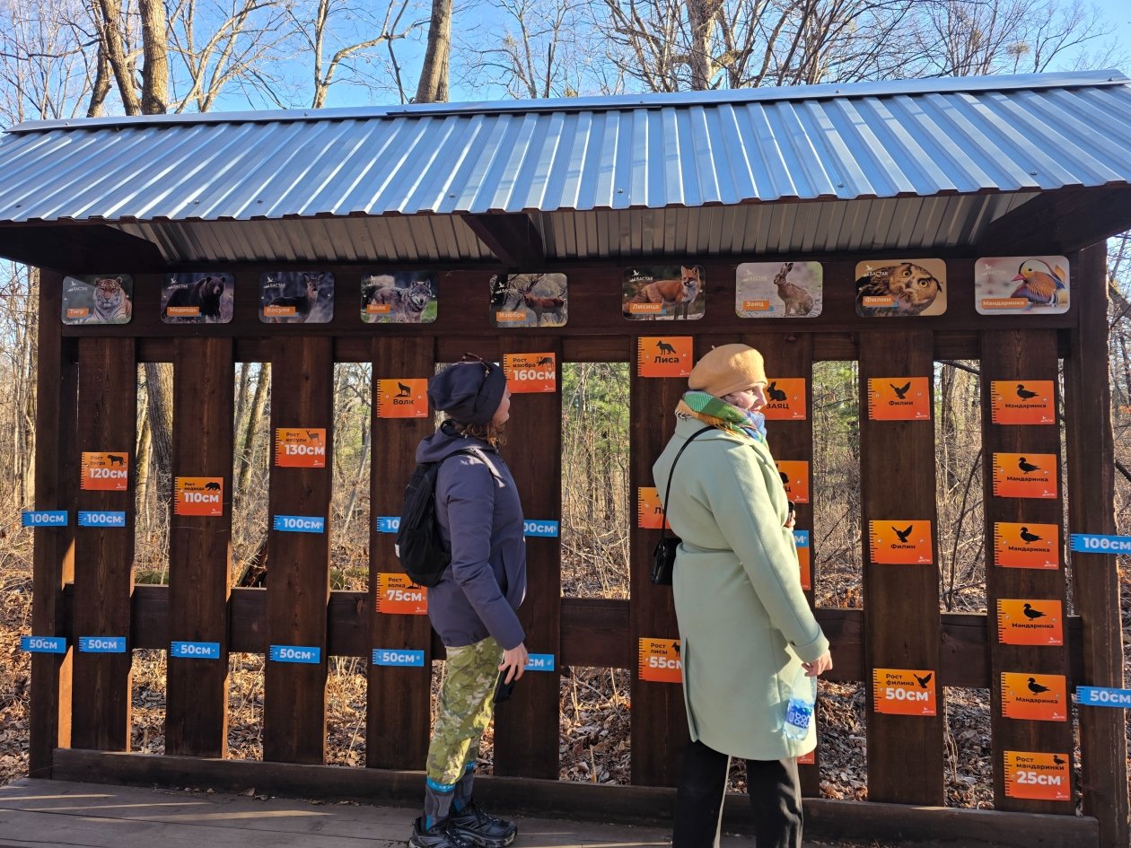 Внимание гостей привлекли точные отпечатки следов обитателей заповедника, представленные на информационных стендах маршрута. Журналисты с интересом сравнивали величину следа взрослого амурского тигра с отпечатком лапы медведя или копытами изюбря. А на специальной "ростовой линейке" участники с азартом принялись замерять свой рост и сравнивать его с параметрами местных обитателей.